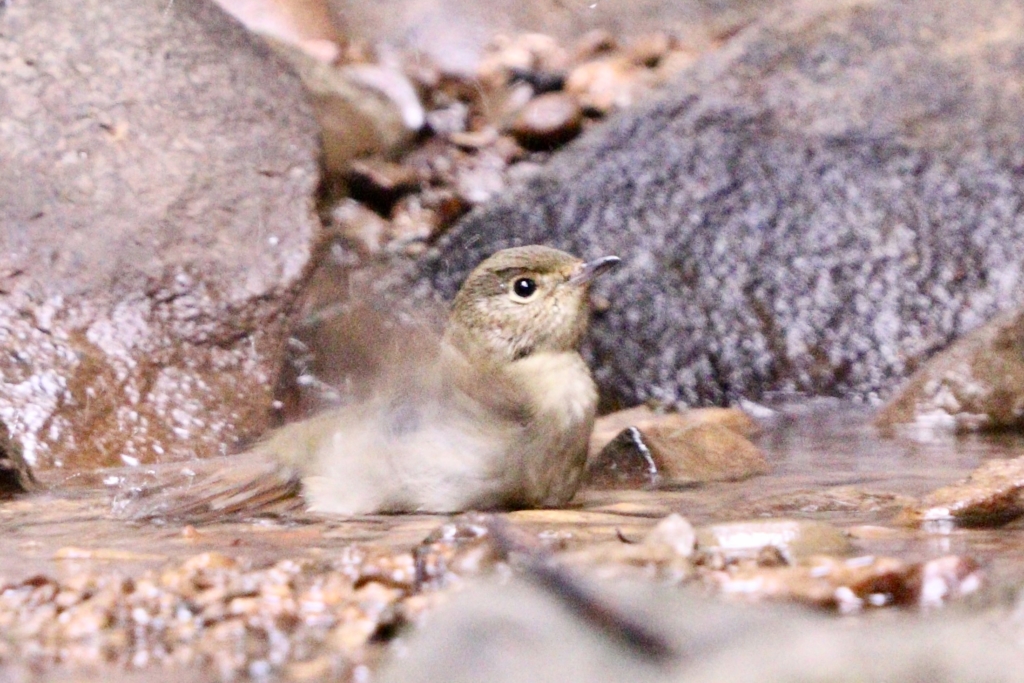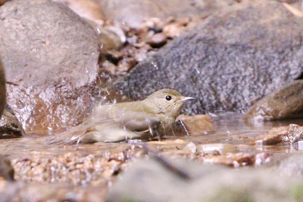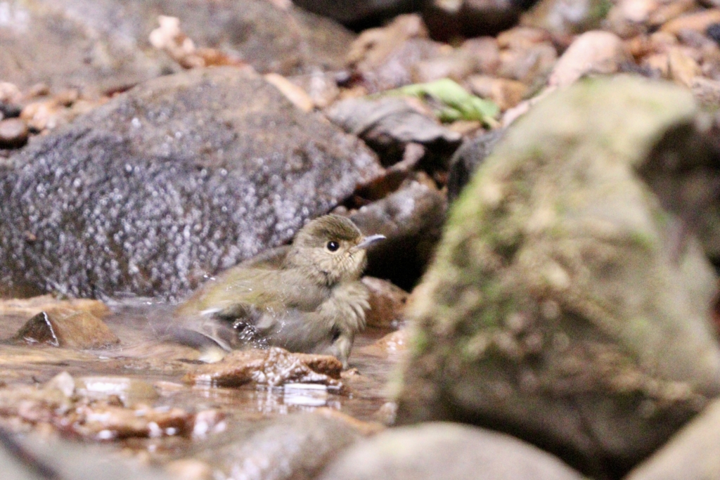 午後3時すぎにいつのも水飲み場スポットへ行ってみたら、2羽のキビタキさんが水浴びしていました。
