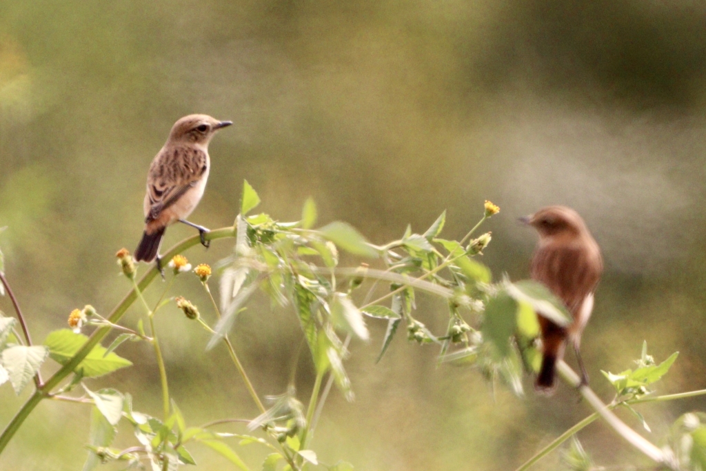 なんて思いながらも9月も過ぎようとする28日(日曜日)の午前中、昨年も同時期にやってきた「ノビタキ」を探しに近くの河原で探鳥していたらやってきたんです「ノビタキ」が。それも2羽で仲良く飛来していました。