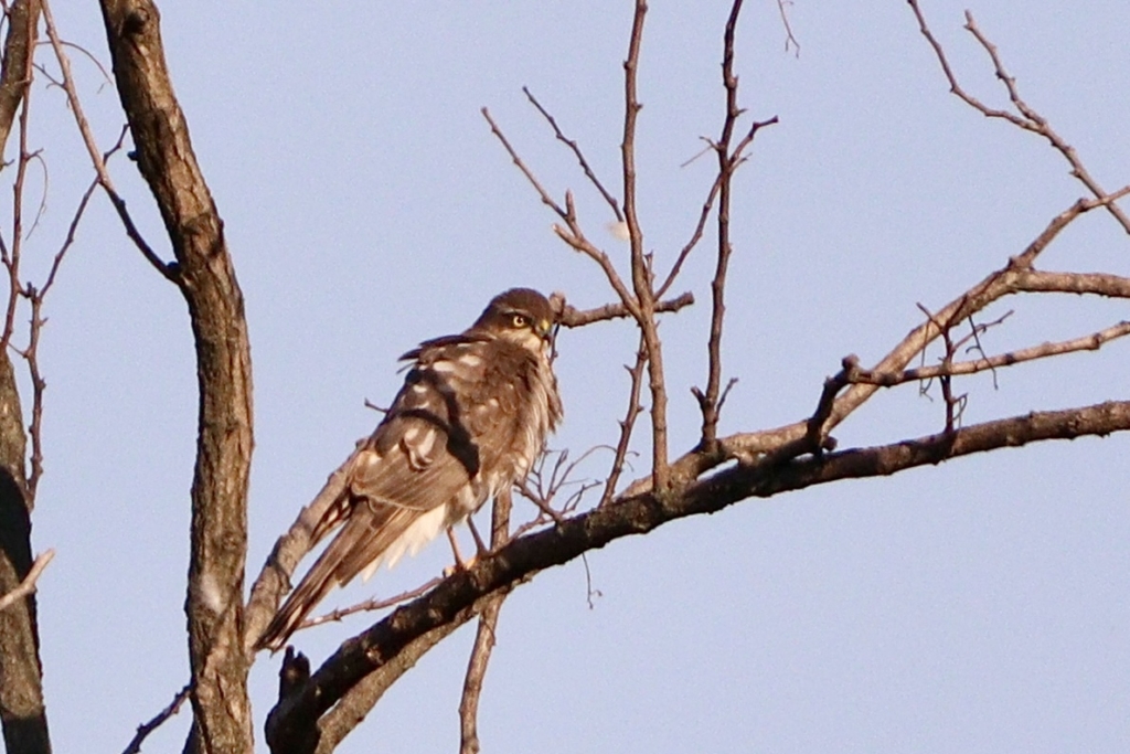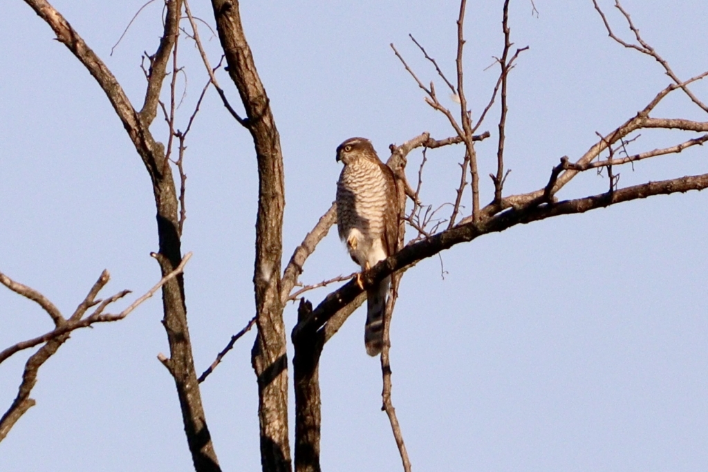 和名:灰鷹(名前の由来は「疾き鷹」が転じてつけられた) 全長♂31㎝・♀39㎝の留鳥(漂鳥)森林で多くみらる小型の鷹です。北海道、本州、四国の平地林や山地林で局地的に繁殖する。秋には小規模な渡りが見られので漂鳥でもある。餌は主に小鳥を捕食する。特徴は、オスは頭部から体上面、尾羽が濃い灰色で喉から体下面は白く橙色の横班がある。メスは頭部から上面及び尾羽が灰色みのある褐色で、明瞭な眉班がある。喉から下面は白く褐色の横班がある。飛翔する姿は翼の下面の模様は黒い横班や横縞(よこしま)模様が明瞭で尾羽は長い。