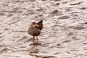 全長32㎝、留鳥である。河川、湖沼、農耕地に生息し主に冬場に観られる。田んぼを見回る田の番人みたいに見えることから「鷭(バン)」。クイナの仲間で雌雄同色。額から嘴が赤色で先端が黄色い。頭から腹にかけては黒く翼はやや緑色がかった褐色で胴の間に白いラインがあり、後ろから見ると尾羽の両方が白い部分がある。「クルルッ」と大きな声で鳴き、水田を外敵から守る番人と言われている。若鳥(幼鳥)期は全体に褐色で額から嘴は赤くなく嘴の先端が黄色い。